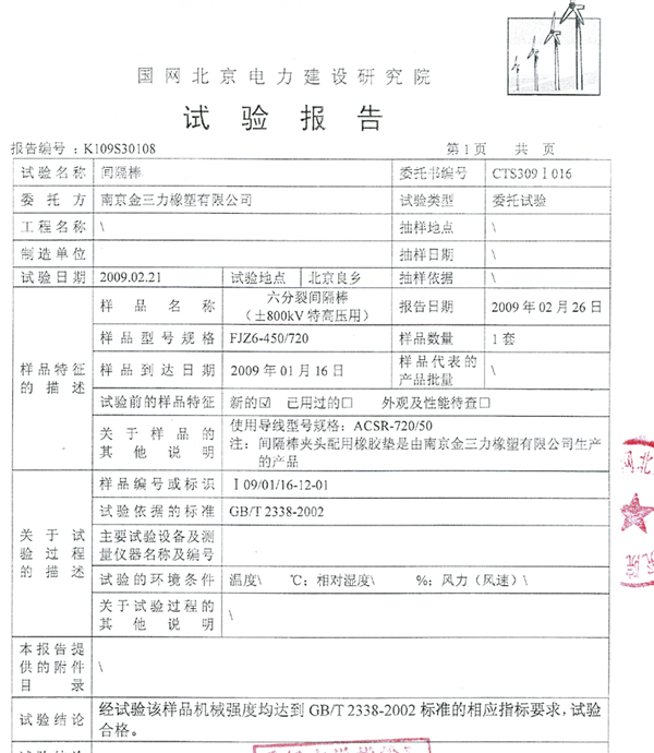 南京金三力橡塑有限公司在近兩年為國內線路器材企業大批配套±500kV高壓、±800kV特高壓直流輸電橡膠阻尼件的基礎上,積累了大量自有技術,形成了超越國外同類產品的配方體系,為我國輸變電技術的進步作出了重要貢獻。2009年3月,公司研制的±800kV特高壓間隔棒阻尼橡膠件通過國家電網北京電力建設研究院的正式測試,完全符合GB/T2338-2002標準要求。