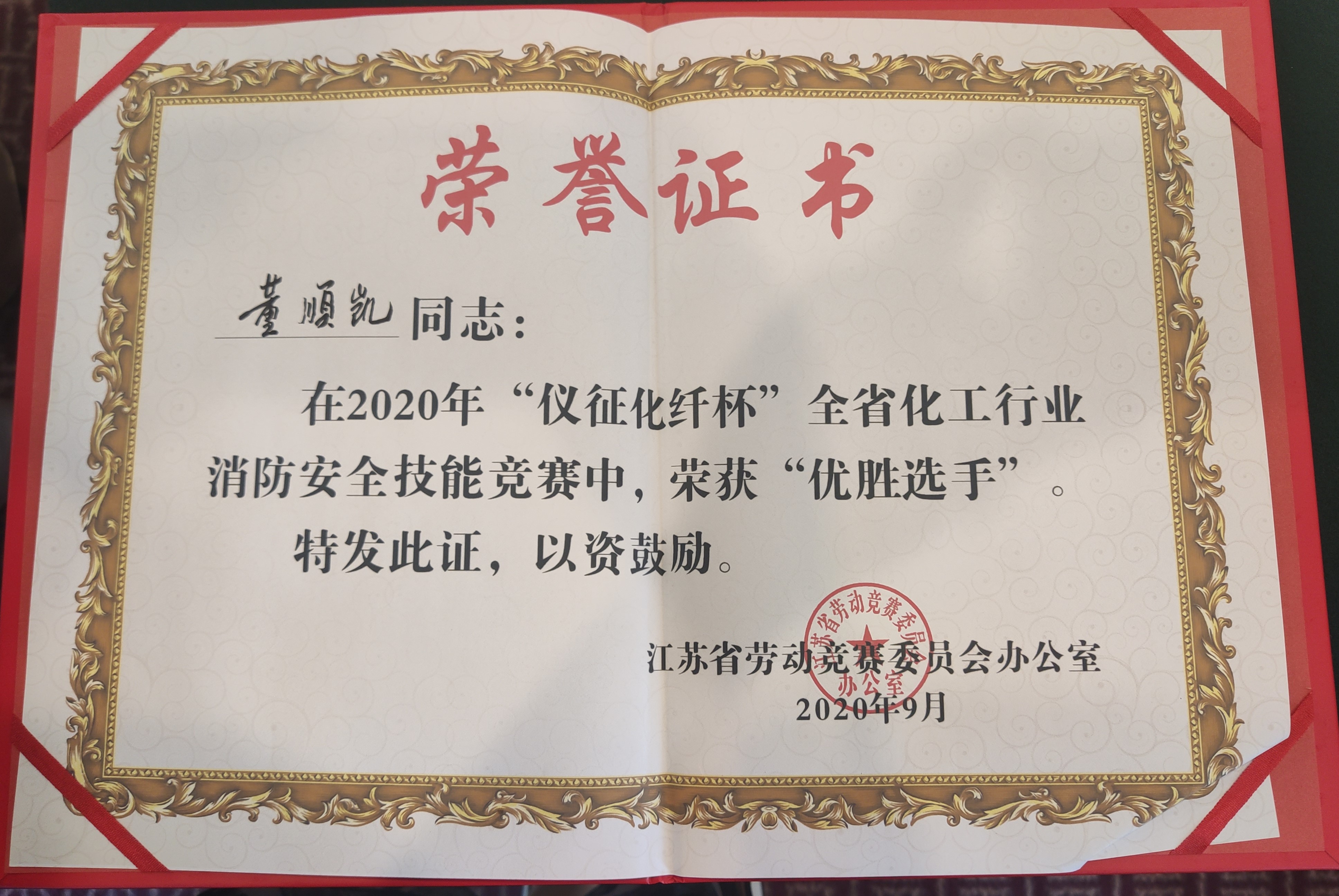 2020年9月21日至23日,南京金三力公司組隊參加江蘇省化工行業消防安全技能競賽,我公司董順凱同志憑借扎實的理論知識及精湛的實操技能在88名選手中脫穎而出,榮獲“優勝選手獎”。